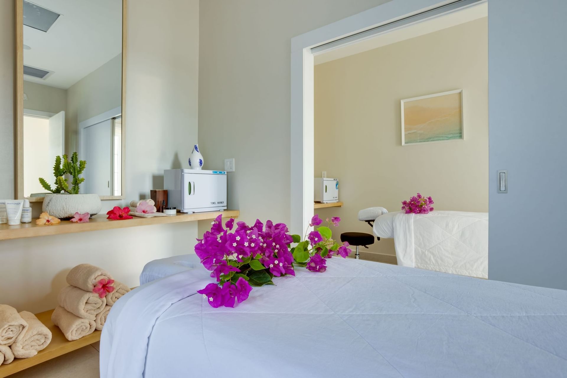 Bright massage room with a glass-walled shower and lounge chair in K'in Spa at Alaia Belize Autograph Collection